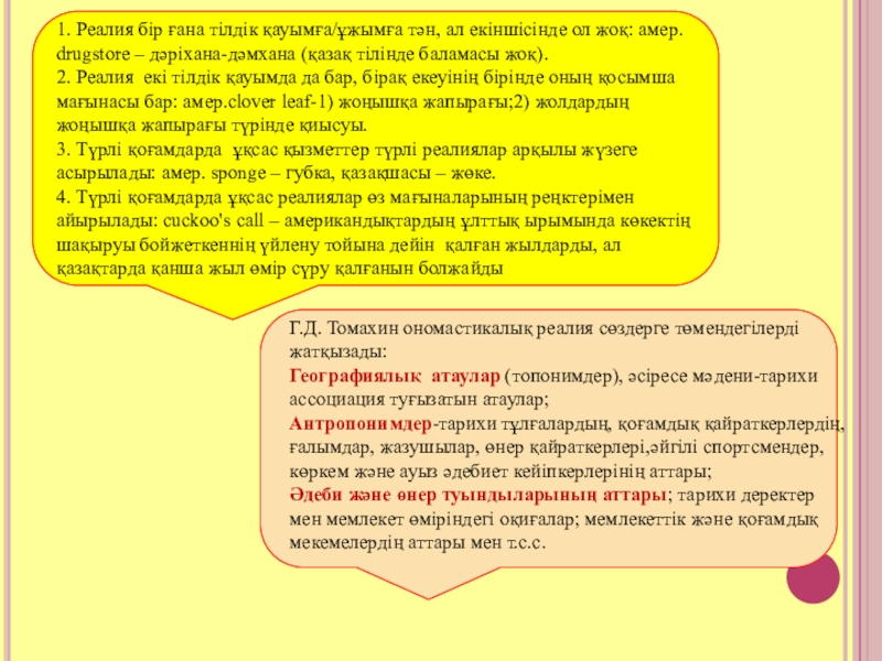 Г.Д. Томахин ономастикалық реалия сөздерге төмендегілерді жатқызады: