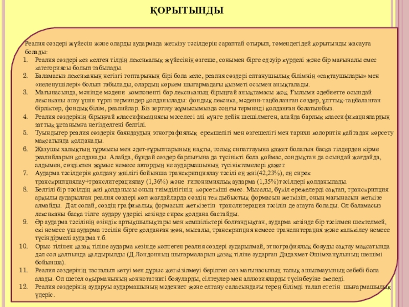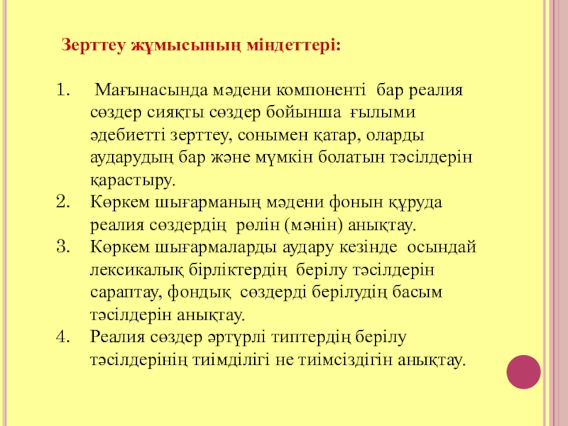 Реалия сөздер – ол «белгілі бір ұлт пен халықтың материалды мәдениетіне, тарихи деректеріне, мемлекеттік институттарына ғана тән аттар, ұлттық және ауыз әдебиеті кейіпкерлерінің аттары және т.б.» (Г.Д. Томахин)