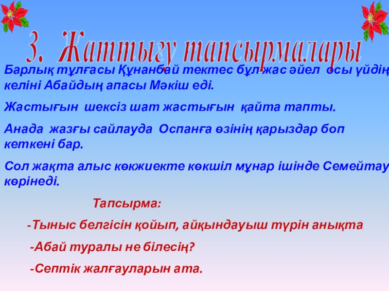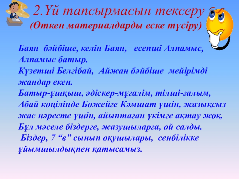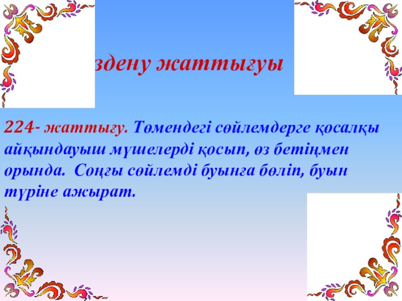 Төмендегі сөйлемдерге қосалқы айқындауыш мүшелерді қосып, өз бетіңмен орында. Соңғы сөйлемді буынға бөліп, буын түріне ажырат.