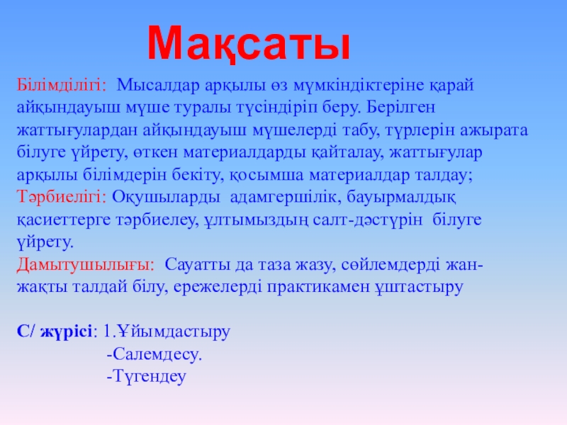 Дамытушылығы: Сауатты да таза жазу, сөйлемдерді жан-жақты талдай білу, ережелерді практикамен ұштастыру