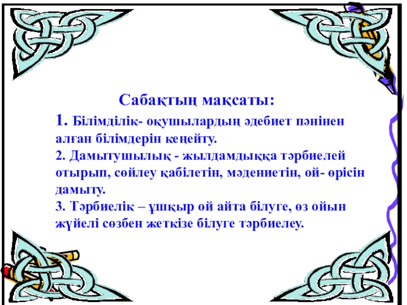 1. Білімділік- оқушылардың әдебиет пәнінен алған білімдерін кеңейту.