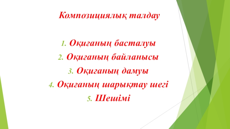 Композициялық талдауОқиғаның басталуыОқиғаның байланысыОқиғаның дамуыОқиғаның шарықтау шегіШешімі