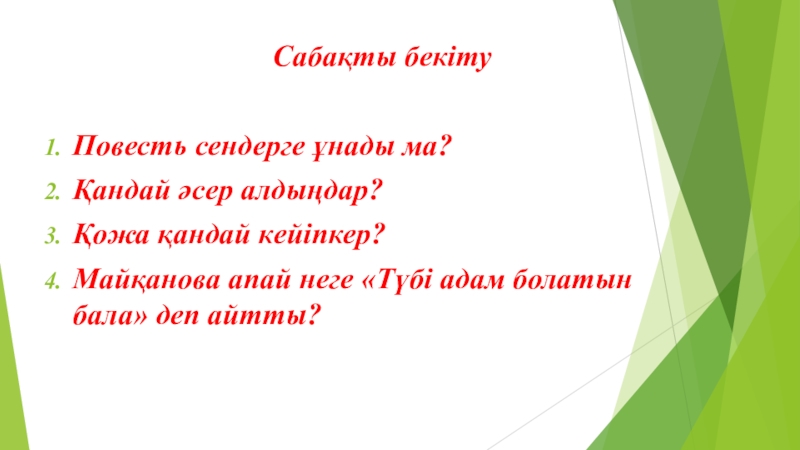 Сабақты бекітуПовесть сендерге ұнады ма?Қандай әсер алдыңдар?Қожа қандай кейіпкер?Майқанова апай неге «Түбі адам болатын бала» деп айтты?
