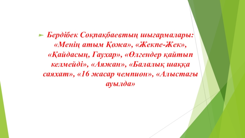 Слайд 3Бердібек Соқпақбаевтың шығармалары: «Менің атым Қожа», «Жекпе-Жек», «Қайдасың, Гаухар», «Өлгендер қайтып