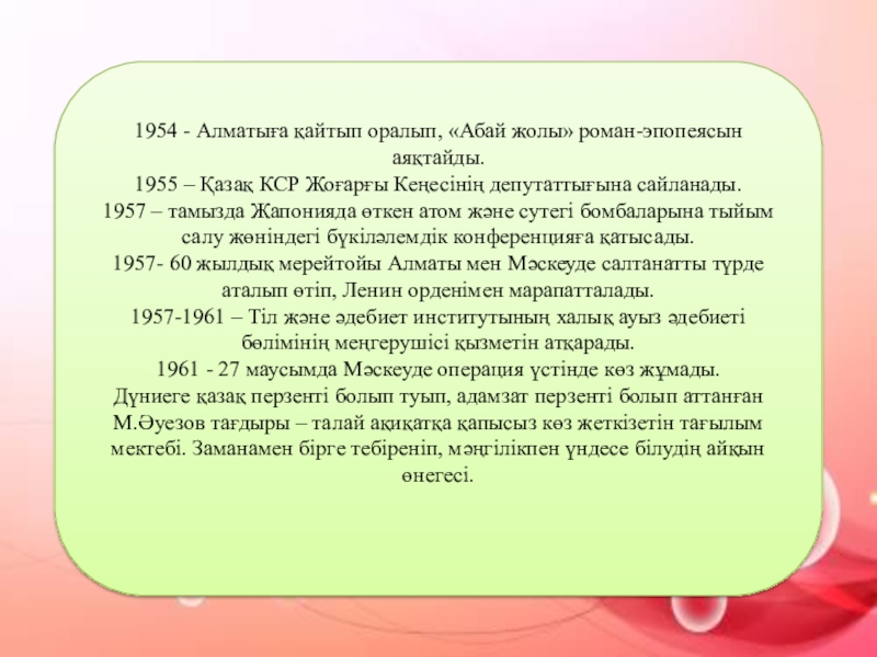 Слайд 51954 - Алматыға қайтып оралып, «Абай жолы» роман-эпопеясын аяқтайды.