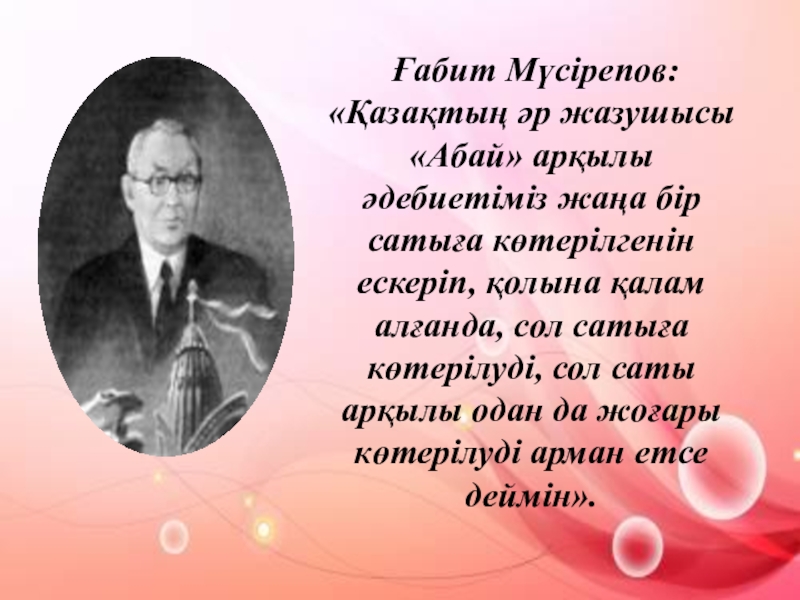 Слайд 6 Ғабит Мүсірепов: «Қазақтың әр жазушысы «Абай» арқылы әдебиетіміз жаңа бір сатыға