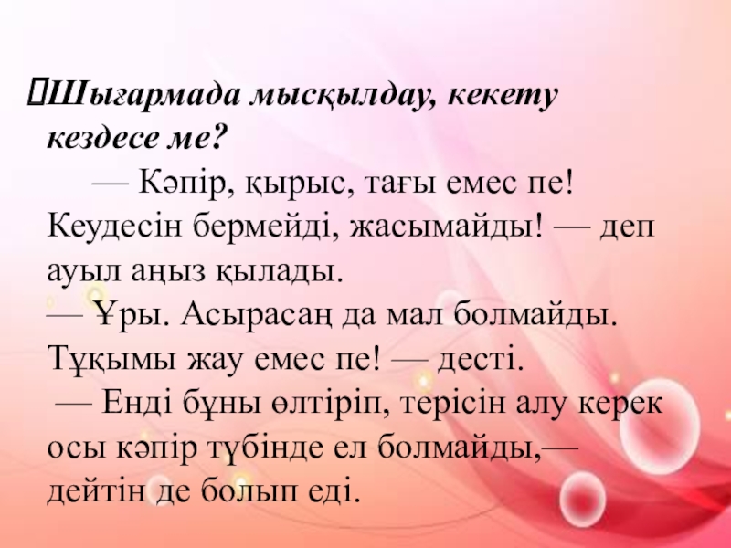 — Енді бұны өлтіріп, терісін алу керек осы кәпір түбінде ел болмайды,— дейтін де болып еді.