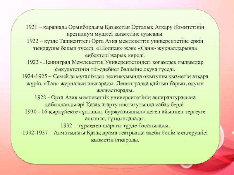 Слайд 31921 – қарашада Орынбордағы Қазақстан Орталық Атқару Комитетінің президиум мүшесі қызметіне