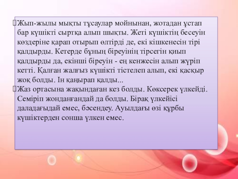 Слайд 8Жып-жылы мықты тұсаулар мойнынан, жотадан ұстап бар күшікті сыртқа алып шықты.