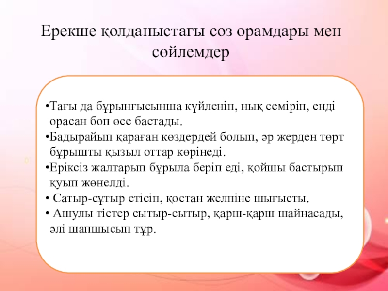 Слайд 14Ерекше қолданыстағы сөз орамдары мен сөйлемдер