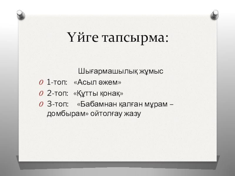 Үйге тапсырма:          Шығармашылық жұмыс1-топ:    «Асыл әжем»2-топ:   «Құтты қонақ»  3-топ:     «Бабамнан қалған мұрам – домбырам» ойтолғау жазу