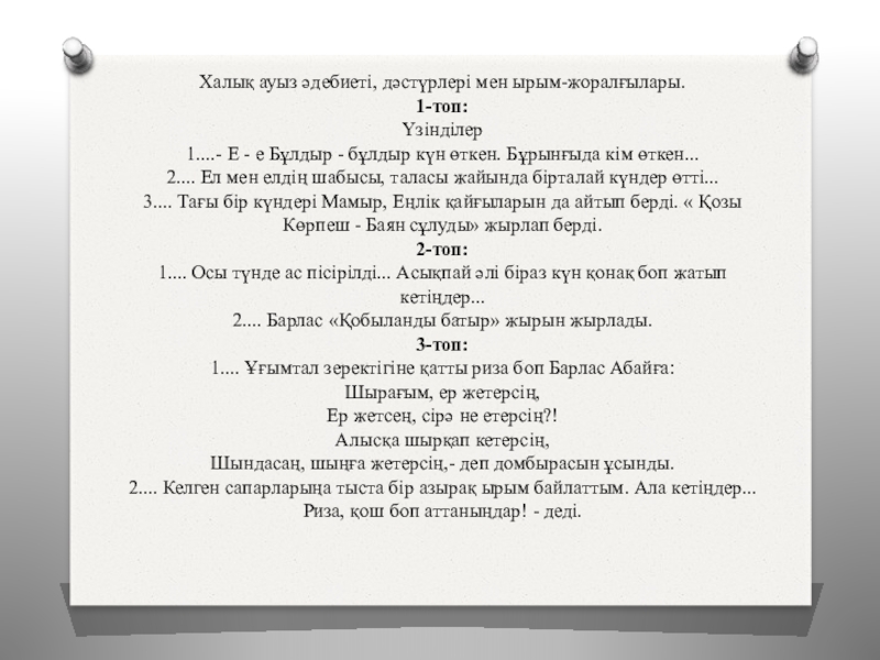 Слайд 8Халық ауыз әдебиеті, дәстүрлері мен ырым-жоралғылары. 1-топ: Үзінділер 1....- Е - е Бұлдыр -