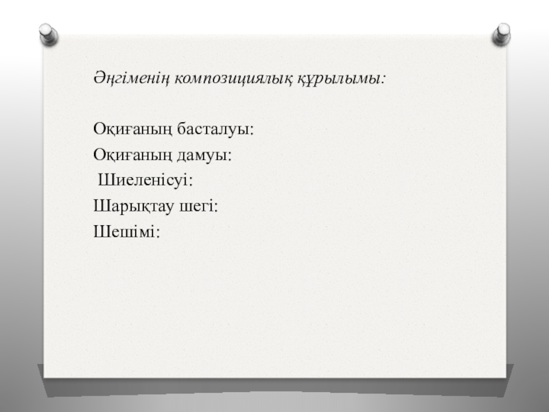 Әңгіменің композициялық құрылымы:Оқиғаның басталуы: Оқиғаның дамуы: Шиеленісуі: Шарықтау шегі: Шешімі: