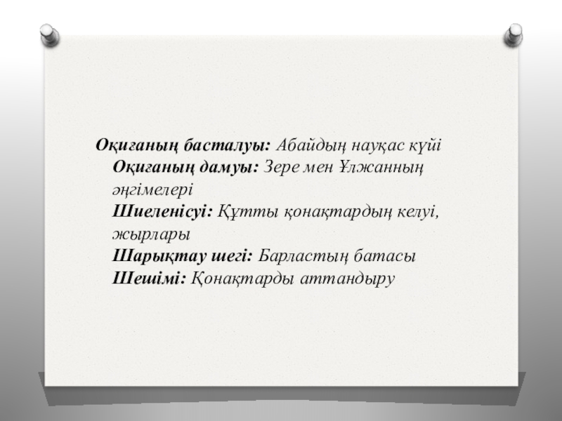 Слайд 7Оқиғаның басталуы: Абайдың науқас күйі Оқиғаның дамуы: Зере мен Ұлжанның әңгімелері Шиеленісуі: Құтты