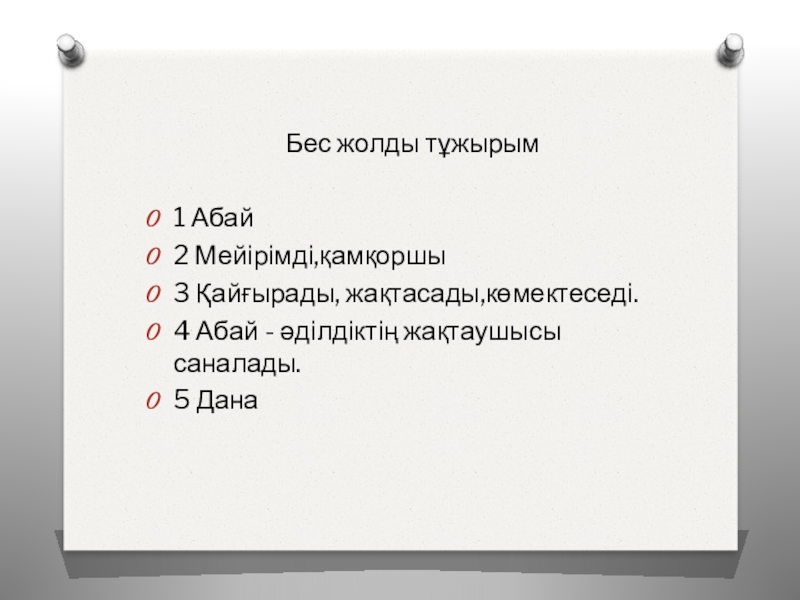 Бес жолды тұжырым1 Абай2 Мейірімді,қамқоршы3 Қайғырады, жақтасады,көмектеседі.4 Абай - әділдіктің жақтаушысы саналады.5 Дана