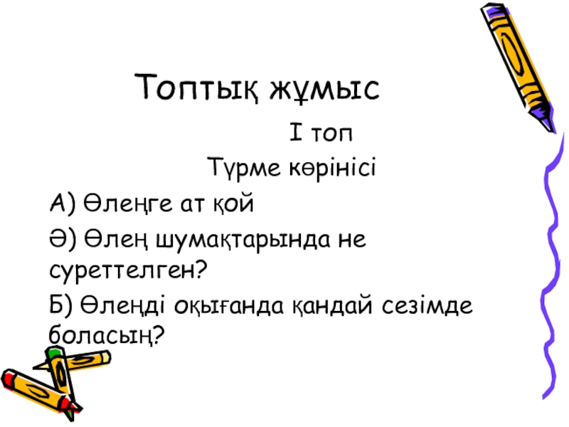Топтық жұмыс    I топТүрме көрінісіА) Өлеңге ат қойӘ) Өлең шумақтарында не суреттелген?Б) Өлеңді оқығанда