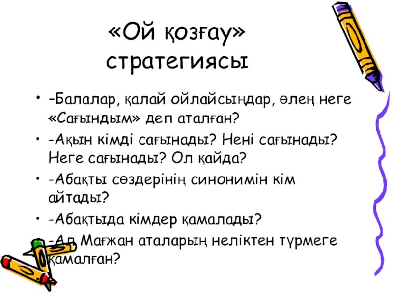 «Ой қозғау» стратегиясы-Балалар, қалай ойлайсыңдар, өлең неге «Сағындым» деп аталған?-Ақын кімді сағынады? Нені сағынады? Неге сағынады? Ол қайда?-Абақты сөздерінің синонимін кім айтады?-Абақтыда кімдер қамалады?-Ал Мағжан аталарың неліктен түрмеге қамалған?--- -