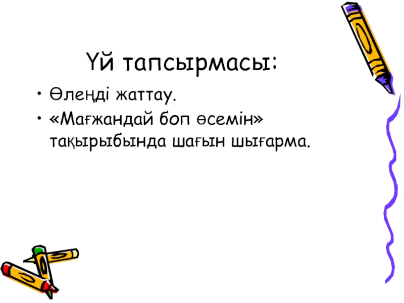 Үй тапсырмасы:Өлеңді жаттау.«Мағжандай боп өсемін» тақырыбында шағын шығарма.