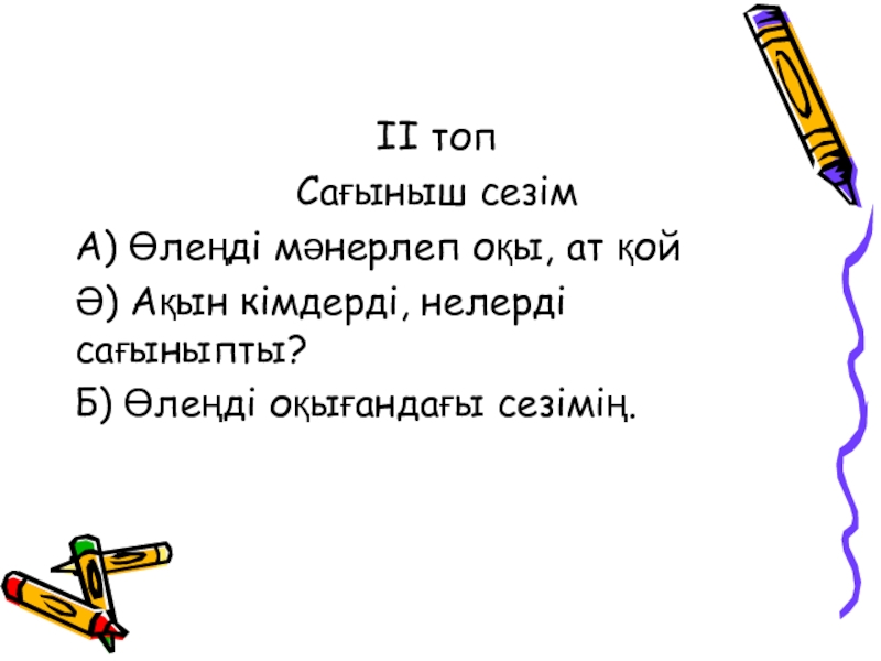 II топСағыныш сезімА) Өлеңді мәнерлеп оқы, ат қойӘ) Ақын кімдерді, нелерді сағыныпты?Б) Өлеңді оқығандағы сезімің.