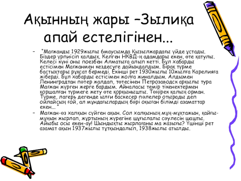 Ақынның жары –Зылиқа апай естелігінен... “Мағжанды 1929жылы 6маусымда Қызылжардағы үйде ұстады. Біздер үрпиісіп қалдық. Келген НКВД-ң адамдары