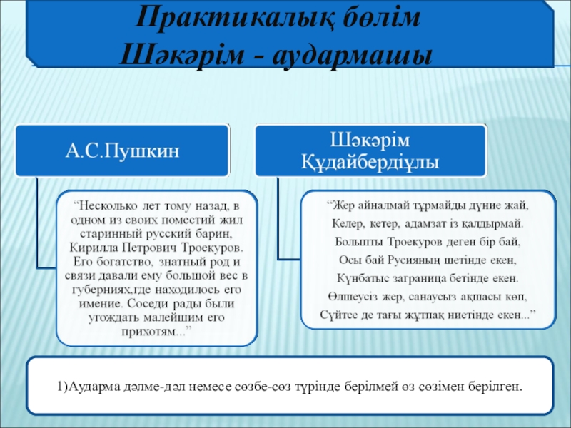 1)Аударма дәлме-дәл немесе сөзбе-сөз түрінде берілмей өз сөзімен берілген.