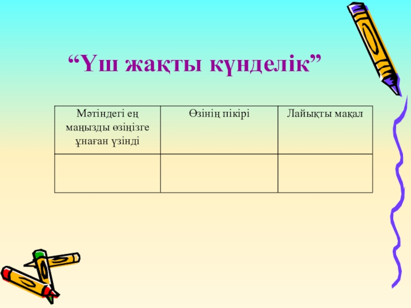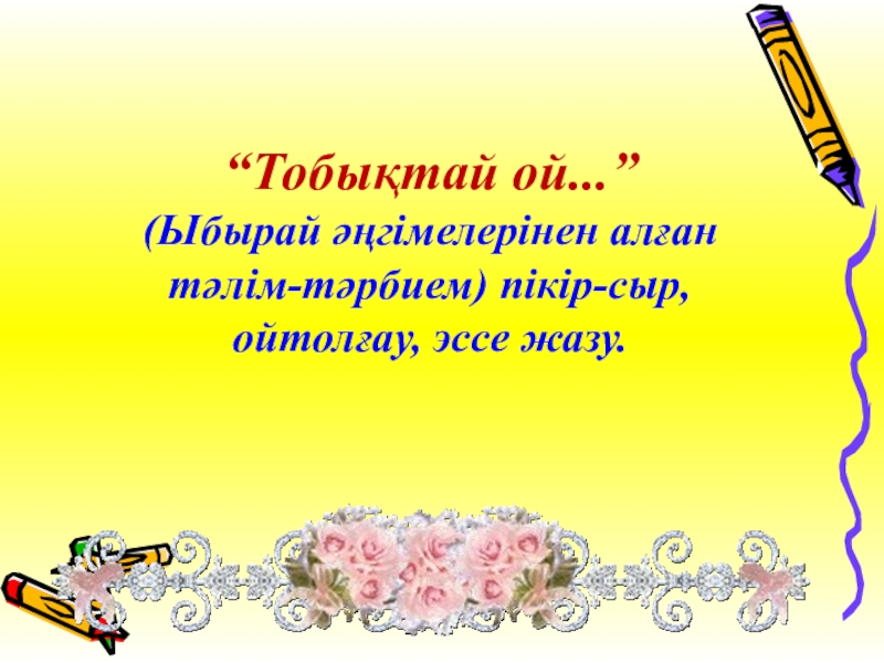 Слайд 9“Тобықтай ой...” (Ыбырай әңгімелерінен алған тәлім-тәрбием) пікір-сыр, ойтолғау, эссе жазу.