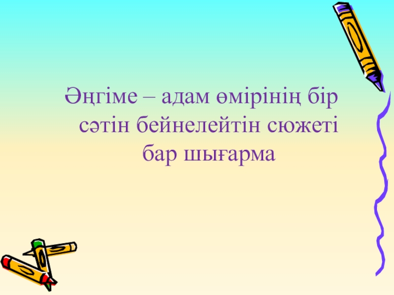 Слайд 5Әңгіме – адам өмірінің бір сәтін бейнелейтін сюжеті бар шығарма