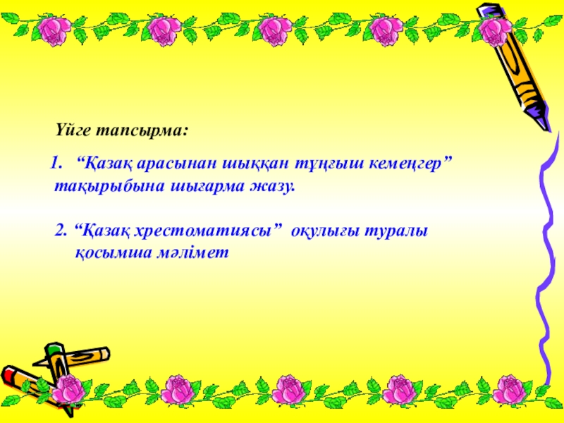 Үйге тапсырма: “Қазақ арасынан шыққан тұңғыш кемеңгер”тақырыбына шығарма жазу.2. “Қазақ хрестоматиясы” оқулығы туралы қосымша мәлімет