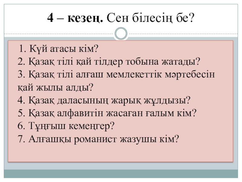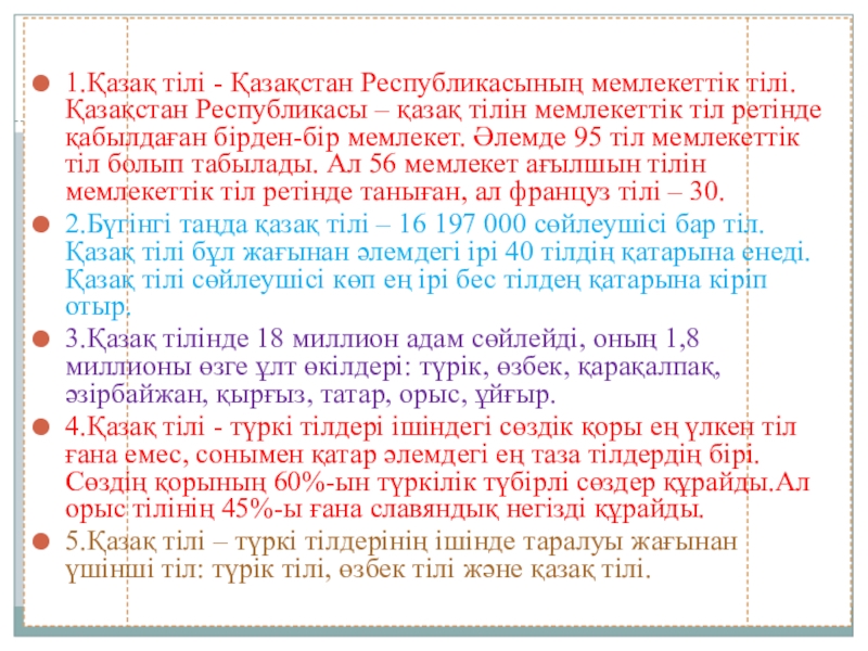 5.Қазақ тілі – түркі тілдерінің ішінде таралуы жағынан үшінші тіл: түрік тілі, өзбек тілі және қазақ тілі.