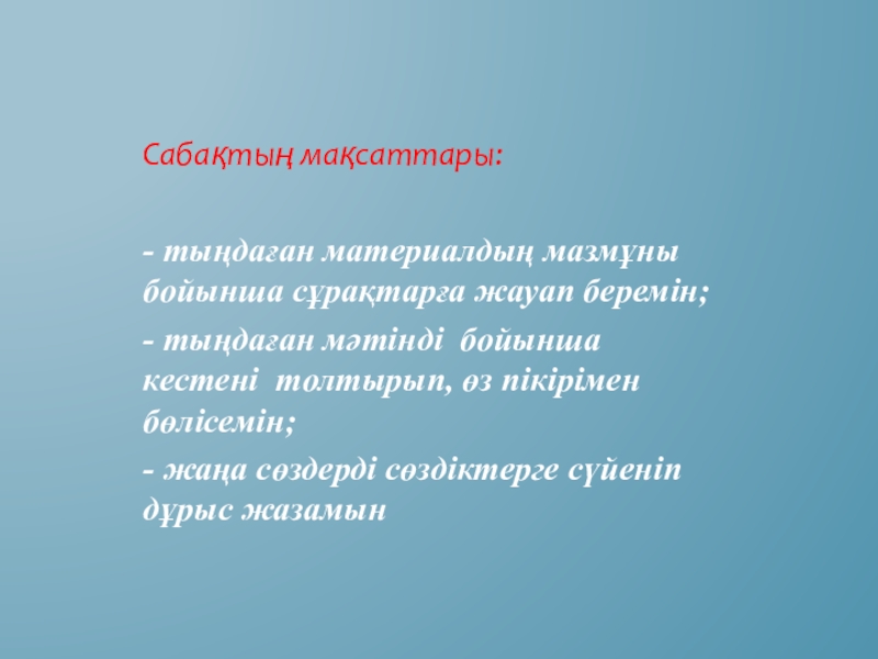 Сабақтың мақсаттары:- тыңдаған материалдың мазмұны бойынша сұрақтарға жауап беремін;- тыңдаған мәтінді бойынша кестені толтырып, өз пікірімен бөлісемін;-