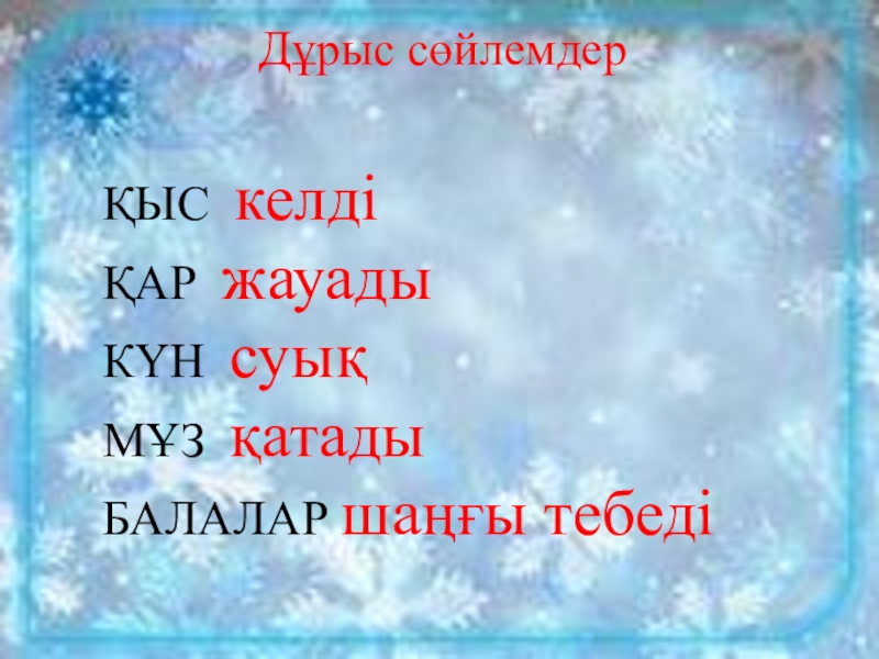 ҚАР жауады КҮН суық МҰЗ қатады БАЛАЛАР шаңғы тебеді