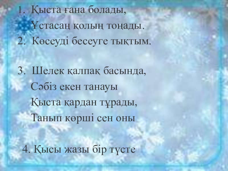 1. Қыста ғана болады,      Ұстасаң қолың тоңады.