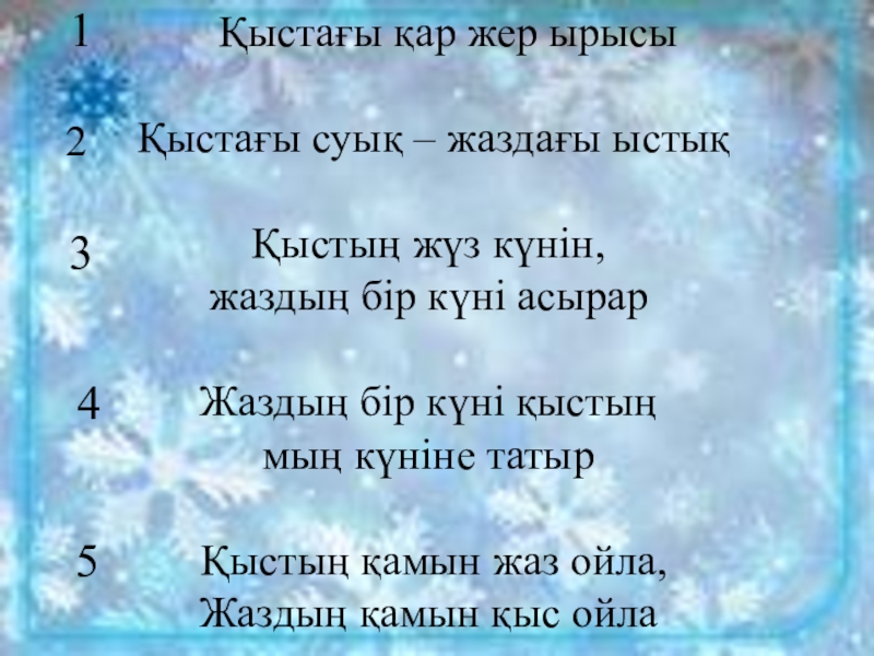 Қыстағы қар жер ырысы Қыстағы суық – жаздағы ыстықҚыстың жүз күнін,жаздың бір күні асырар Жаздың
