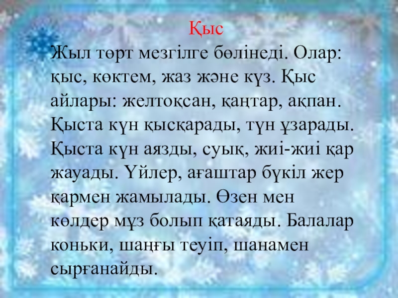 Қыс айлары: желтоқсан, қаңтар, ақпан. Қыста күн қысқарады, түн ұзарады. Қыста күн аязды, суық, жиі-жиі қар жауады. Үйлер, ағаштар бүкіл жер қармен жамылады. Өзен мен көлдер мұз болып қатаяды. Балалар коньки, шаңғы теуіп, шанамен сырғанайды.