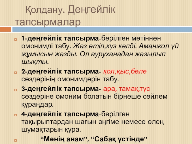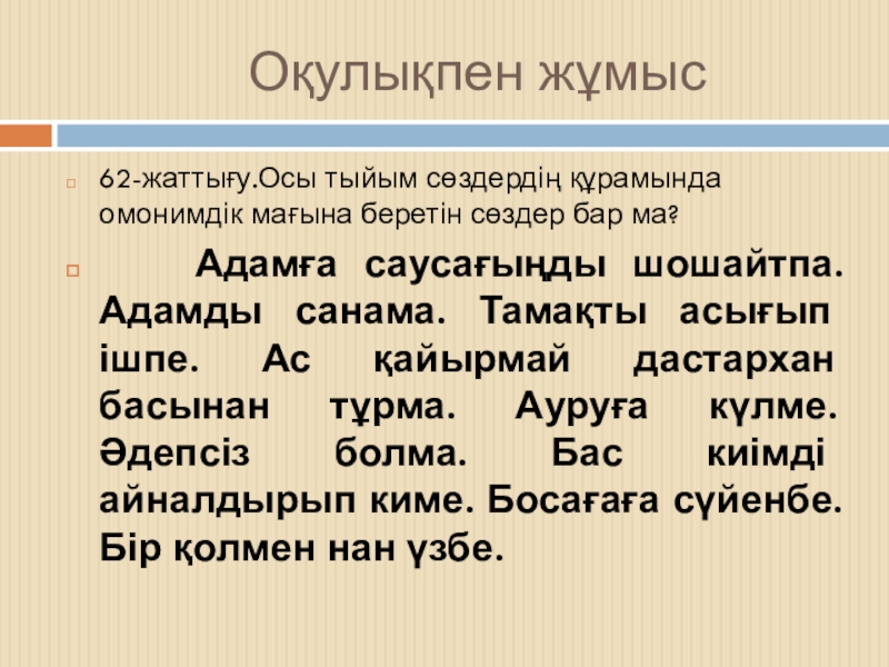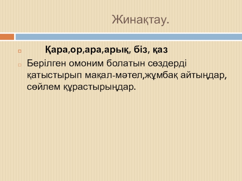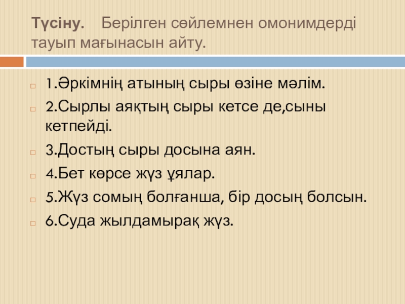 Берілген омоним болатын сөздерді қатыстырып мақал-мәтел,жұмбақ айтыңдар,сөйлем құрастырыңдар.