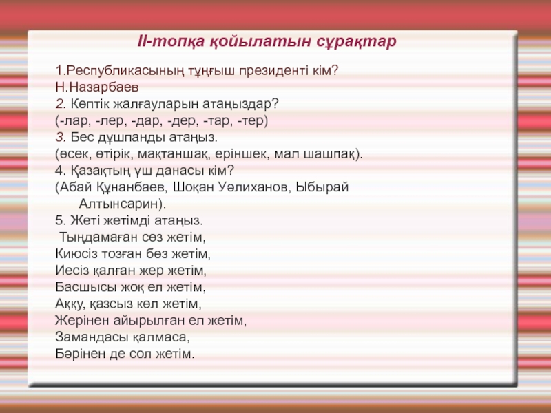 Бұл кезеңде әр топқа 5 сұрақ беріледі. Дұрыс жауап берсе,10 ұпай.
