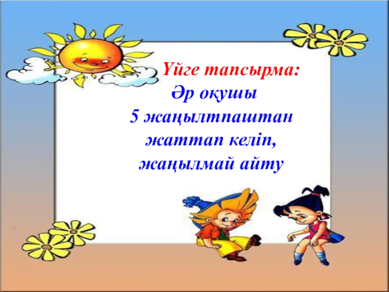 Үйге тапсырма: Әр оқушы 5 жаңылтпаштан жаттап келіп, жаңылмай айту