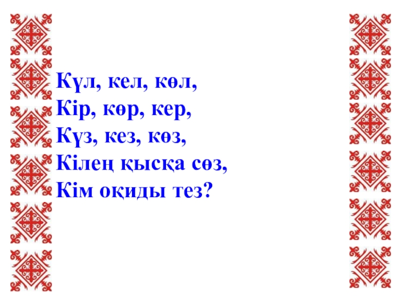 Күл, кел, көл, Кір, көр, кер,Күз, кез, көз,Кілең қысқа сөз,Кім