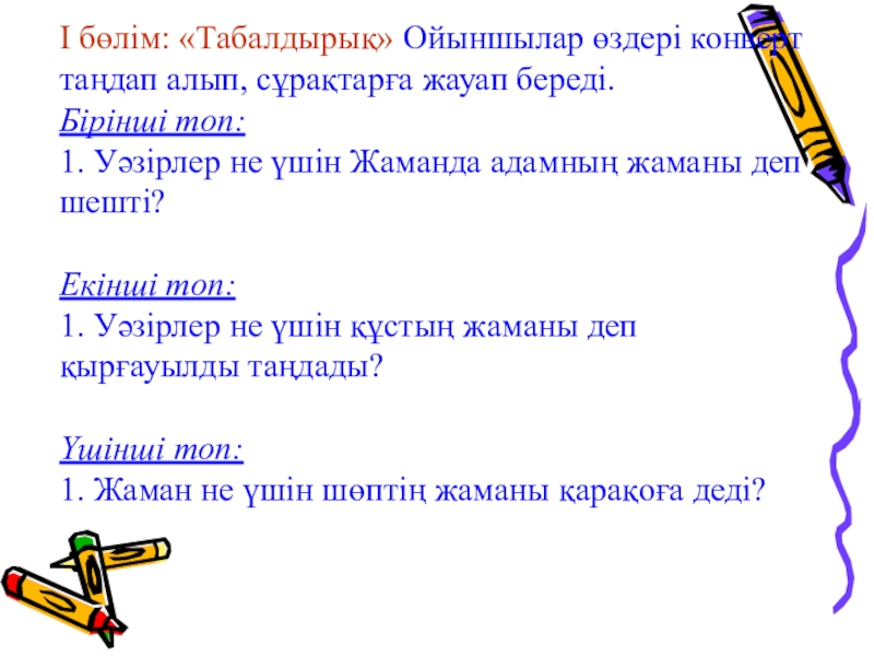 Слайд 7І бөлім: «Табалдырық» Ойыншылар өздері конверт таңдап алып, сұрақтарға жауап береді.