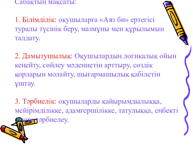 1. Білімділік: оқушыларға «Аяз би» ертегісі туралы түсінік беру, мазмұны