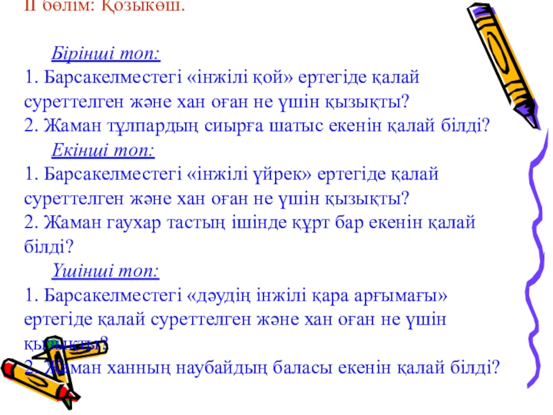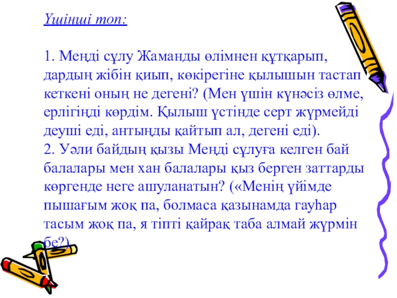 2. Уәли байдың қызы Меңді сұлуға келген бай балалары мен хан балалары қыз берген заттарды көргенде неге ашуланатын? («Менің үйімде пышағым жоқ па, болмаса қазынамда гауһар тасым жоқ па, я тіпті қайрақ таба алмай жүрмін бе?)