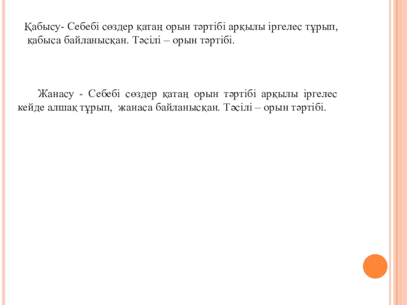 Жанасу - Себебі сөздер қатаң орын тәртібі арқылы іргелес кейде алшақ тұрып, жанаса байланысқан. Тәсілі – орын тәртібі.