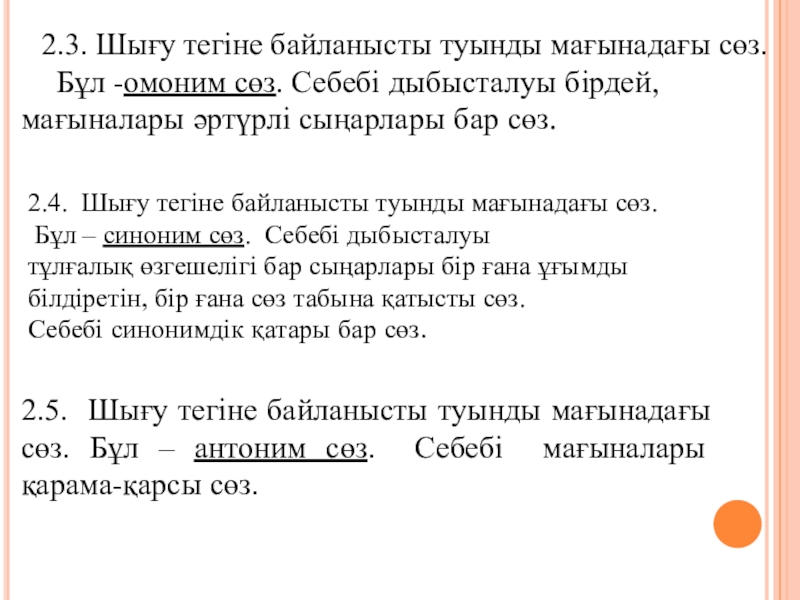 2.5. Шығу тегіне байланысты туынды мағынадағы сөз. Бұл – антоним сөз. Себебі мағыналары қарама-қарсы сөз.