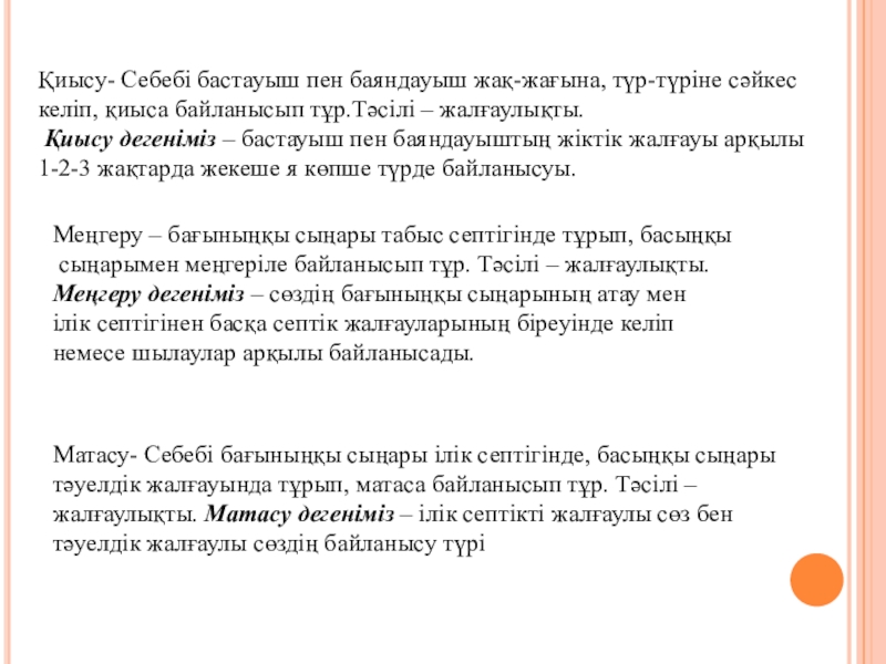 Матасу- Себебі бағыныңқы сыңары ілік септігінде, басыңқы сыңары тәуелдік жалғауында тұрып, матаса байланысып тұр. Тәсілі – жалғаулықты. Матасу дегеніміз – ілік септікті жалғаулы сөз бен тәуелдік жалғаулы сөздің байланысу түрі