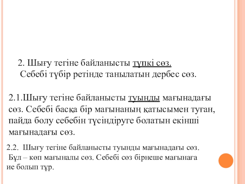 2.1.Шығу тегіне байланысты туынды мағынадағы сөз. Себебі басқа бір мағынаның қатысымен туған, пайда болу себебін түсіндіруге болатын екінші мағынадағы сөз.