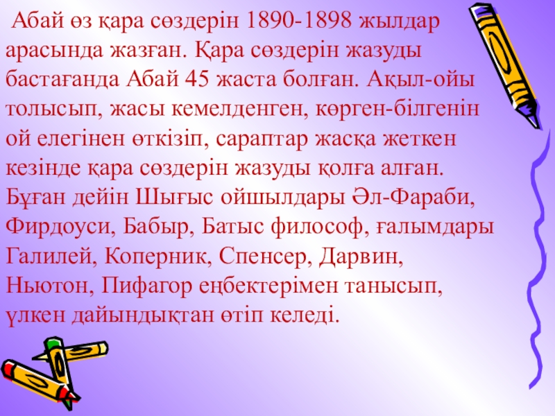 Слайд 6 Абай өз қара сөздерін 1890-1898 жылдар арасында жазған. Қара сөздерін