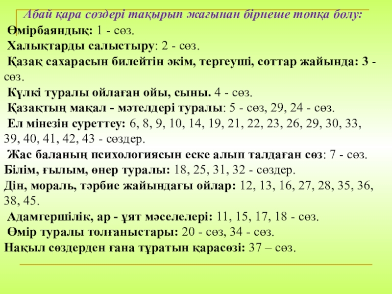 Слайд 7 Абай қара сөздері тақырып жағынан бірнеше топқа бөлу:
