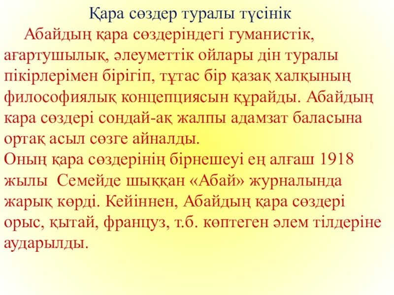 туралы пікірлерімен бірігіп, тұтас бір қазақ халқының философиялық концепциясын құрайды. Абайдың кара сөздері сондай-ақ жалпы адамзат баласына ортақ асыл сөзге айналды.