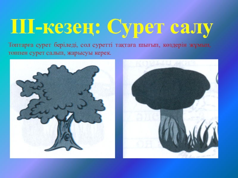 ІІІ-кезең: Сурет салуТоптарға сурет беріледі, сол суретті тақтаға шығып, көздерін жұмып, топпен сурет салып, жарысуы керек.
