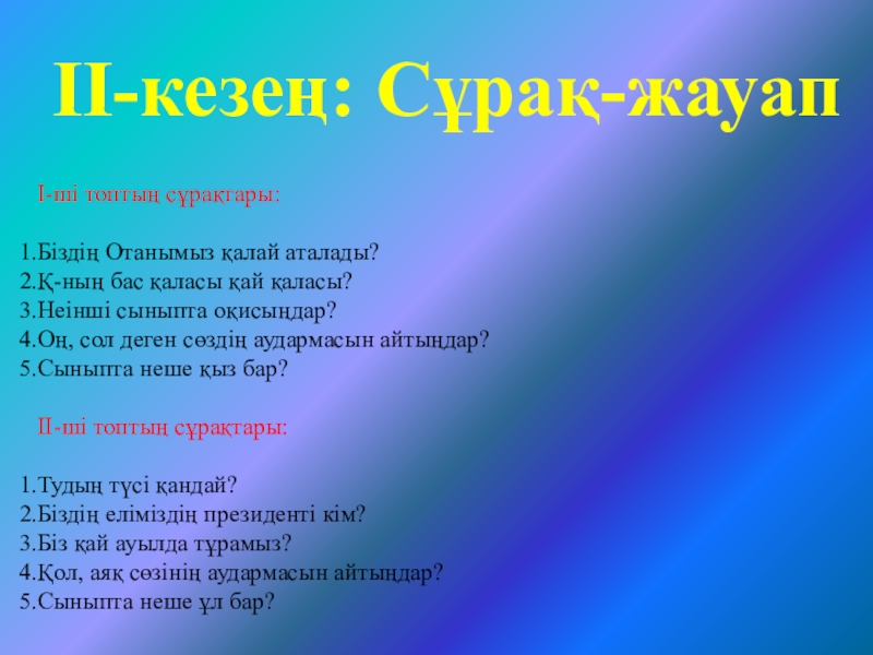 ІІ-кезең: Сұрақ-жауапІ-ші топтың сұрақтары:Біздің Отанымыз қалай аталады?Қ-ның бас қаласы қай қаласы?Неінші сыныпта оқисыңдар?Оң, сол деген сөздің аудармасын